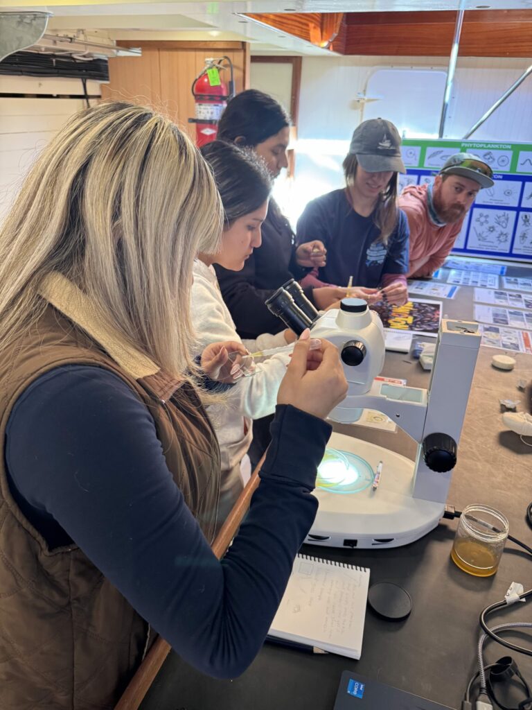 Conversations at these stations are scaled to the group. With elementary students, we might talk about food webs and consider how the plankton they observed under the microscope in the ship’s lab influences the sea lions swimming off the bow. With high schoolers, we dive deeper into the history of conservation, using Elkhorn Slough itself as a powerful case study in restoration and stewardship.