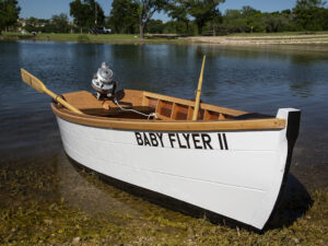 El domingo 14 de abril de 2019, después de más de 500 horas de trabajo, bautizamos y lanzamos el Folleto Bebé II en el cercano lago Travis, justo al norte de Austin, Texas. Mi esposa Pam salpicó agua desde Puget Sound en la proa, traída por Chris desde Port Townsend, Washington, frente a las 37 personas que asistieron. Creo que este fue un bautismo apropiado para un modelo de Texas del barco construido y utilizado originalmente en esa región. El día era hermoso y tranquilo, y mi motor Johnson Seahorse de 1937 obtenido en eBay, la “vaca marina” del cuento de Steinbeck, se sintió atraído a arrancar e impulsar sin problemas el esquife de tres metros alrededor de la cala protegida que habíamos elegido.