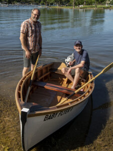 Para mí personalmente, la necesidad de conectar con su proyecto y ser solidario fue irresistible, dada la influencia del libro en mi vida. Por eso, he seguido de cerca su progreso y me mantuve en contacto con Chris Chase, el director del proyecto. Eso ha incluido visitar el estado de Washington durante períodos prolongados y visitar con frecuencia el astillero de Port Townsend para observar el trabajo. Para sentirme aún más conectado, también comencé mi propio proyecto de barco en mi casa en Texas: la construcción de un “Baby Flyer”, una réplica aproximada del esquife de madera de diez pies que juega un papel importante y a menudo cómico en el historia. Al no tener experiencia en la construcción de barcos, definitivamente fue un desafío, pero trabajando cuidadosamente con el amplio asesoramiento y apoyo a larga distancia de Chris, surgió la forma de un barco en mi garaje. Y para completarlo, localicé un buen candidato para el malvado motor fueraborda “Hansen Sea Cow” cuyo comportamiento errático irrita a toda la tripulación durante toda la expedición.