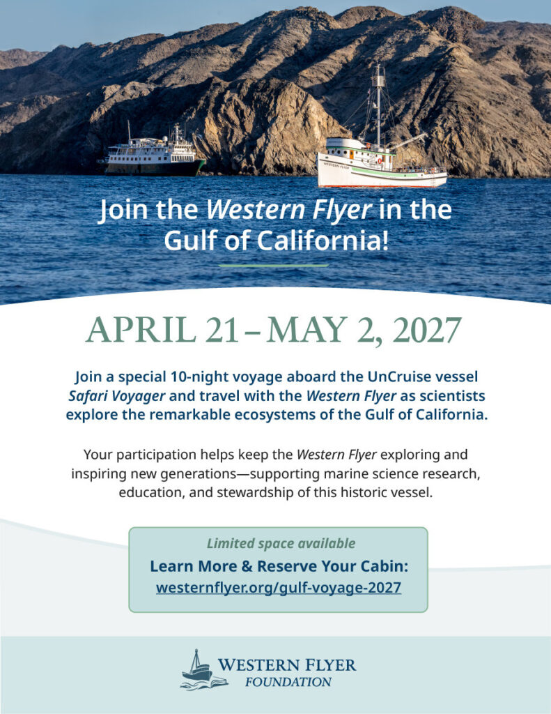 In spring 2027, the Western Flyer is returning to the waters that inspired The Log from the Sea of Cortez. Join a special 10-night voyage aboard the UnCruise vessel Safari Voyager and travel with the Western Flyer as scientists explore the remarkable ecosystems of the Gulf of California.