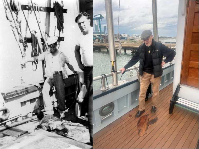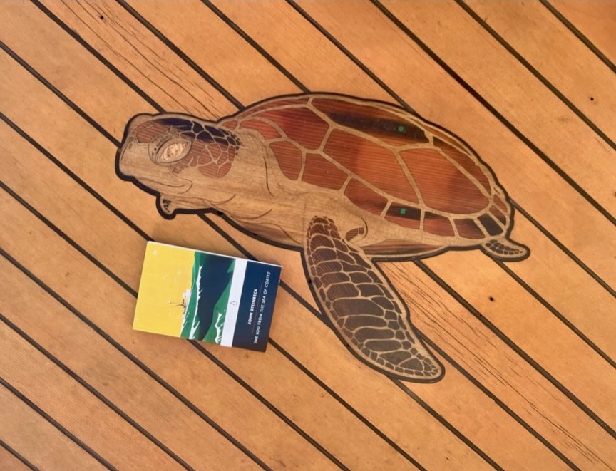 To mark the site of the turtle’s demise, and to remind ourselves of the story, we have added an inlaid wooden turtle to the aft deck of the Western Flyer.